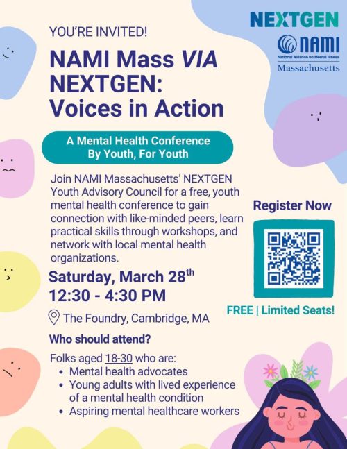 We are excited to invite you to NAMI Massachusetts’ NEXTGEN Youth Advisory Council’s upcoming Voices in Action (VIA) Conference: A Mental Health Conference By Youth, For Youth. This conference will be held at The Foundry (101 Rogers Street, Cambridge, MA 02142) on Saturday, March 28th from 12:30 – 4:30 PM.